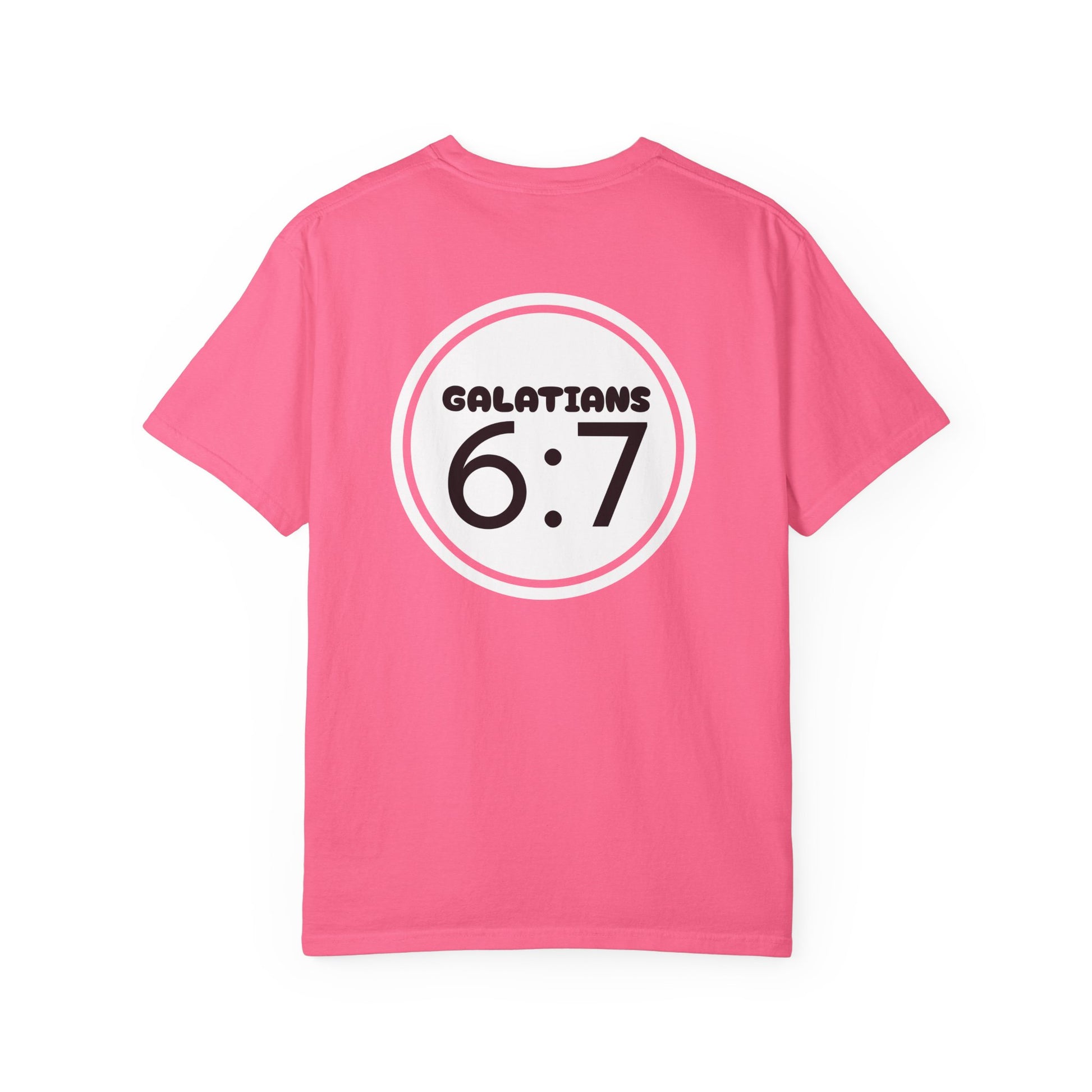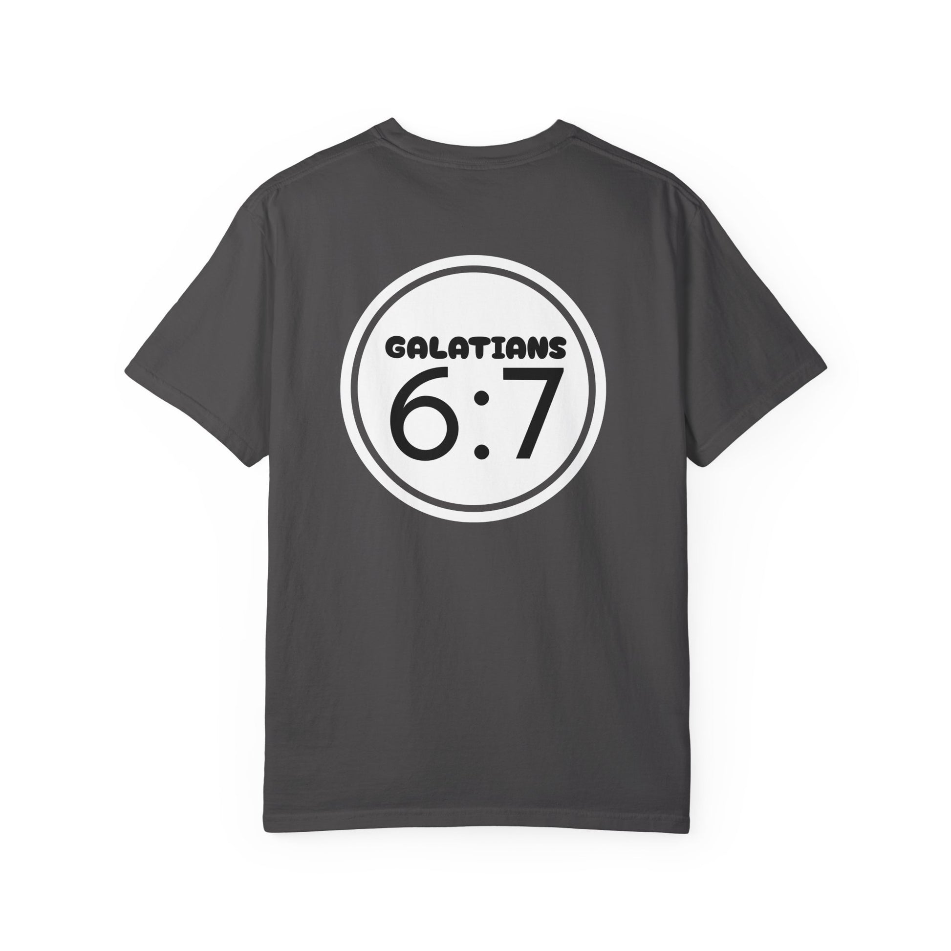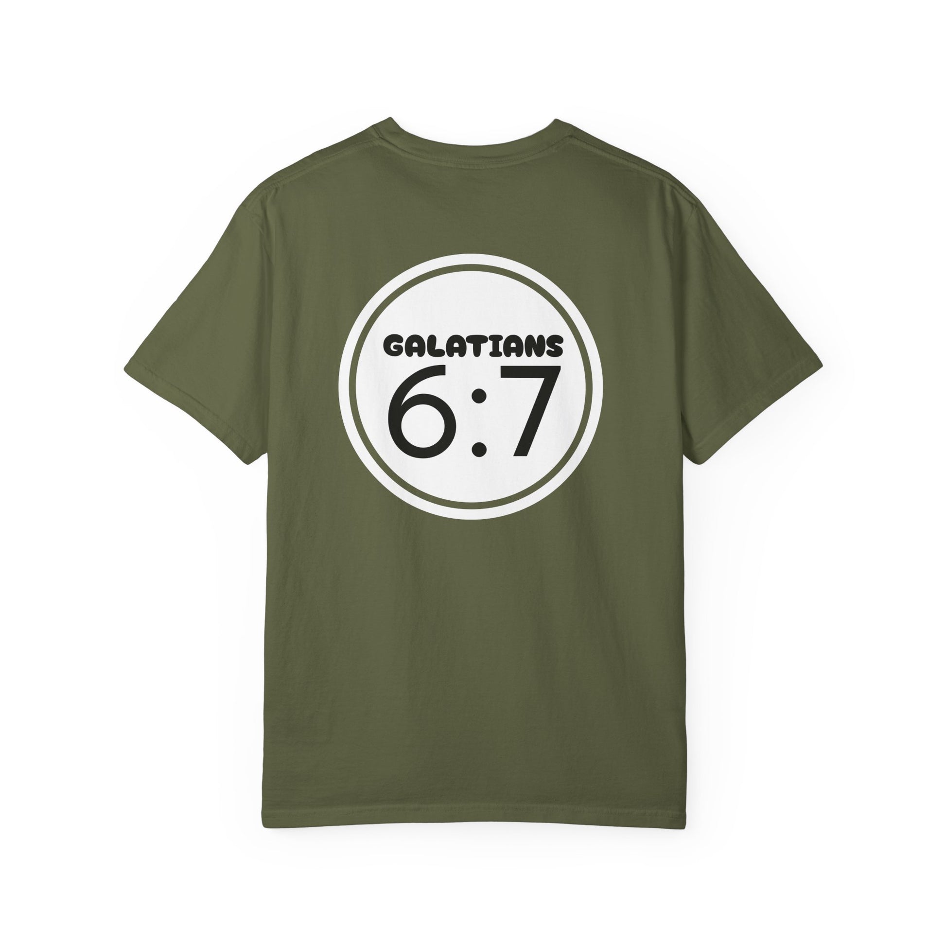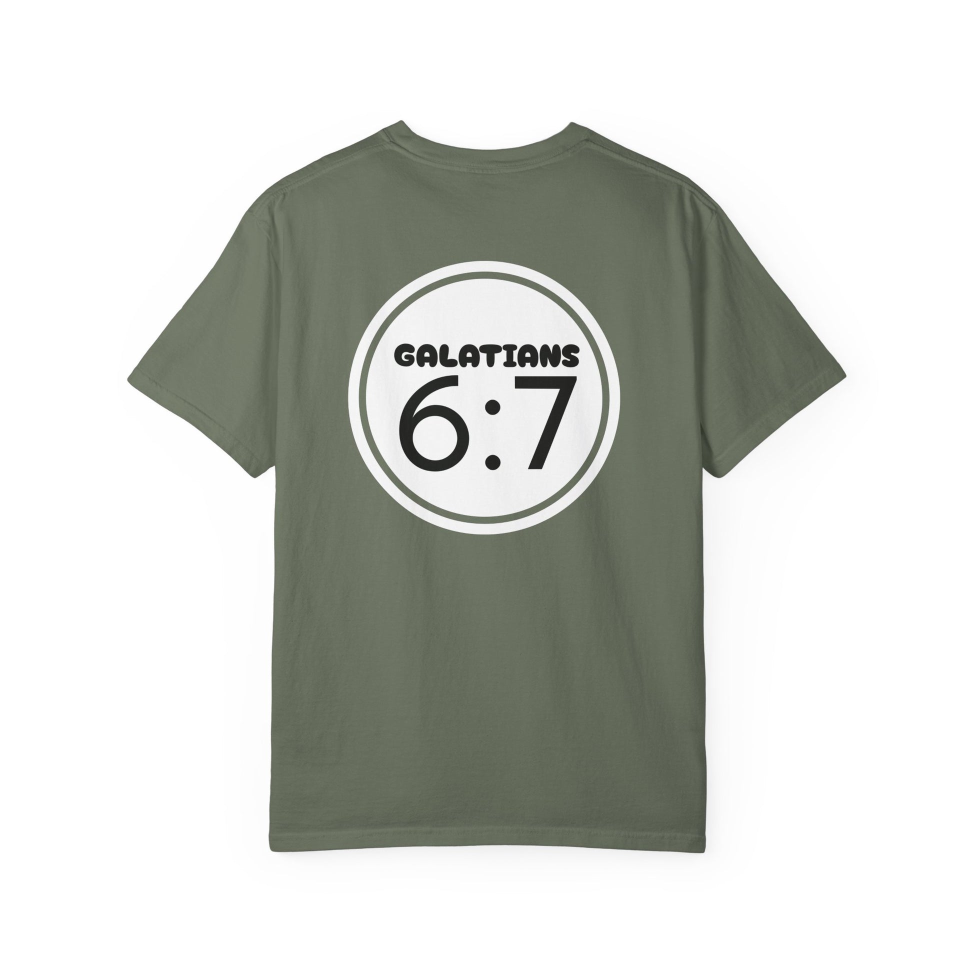 A comfortable and durable garment-dyed T-shirt featuring the Biblical verse Galatians 6:7. This tee provides a relaxed fit and is made with 100% ring-spun US cotton for long-lasting comfort. It is perfect for those seeking a soft color and texture in their clothing. Ideal for those who appreciate Christian scripture on their apparel. Relevant for religious holidays, church events, and everyday wear.