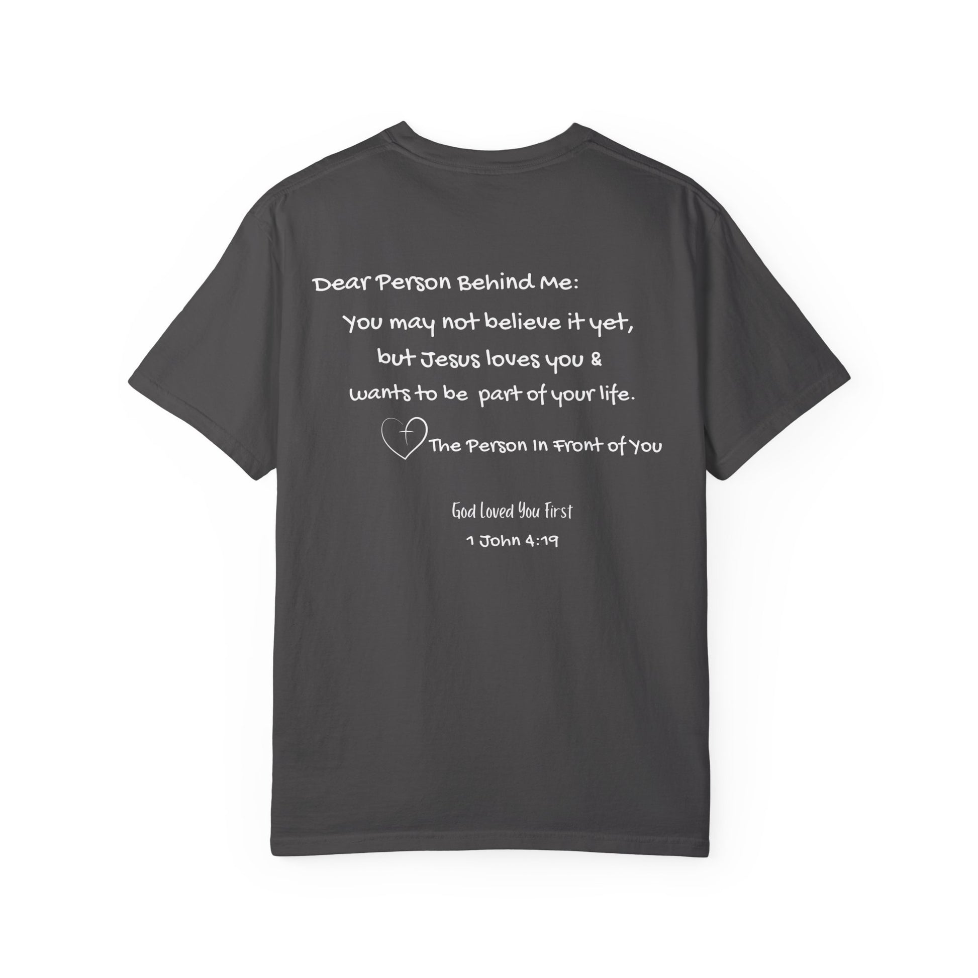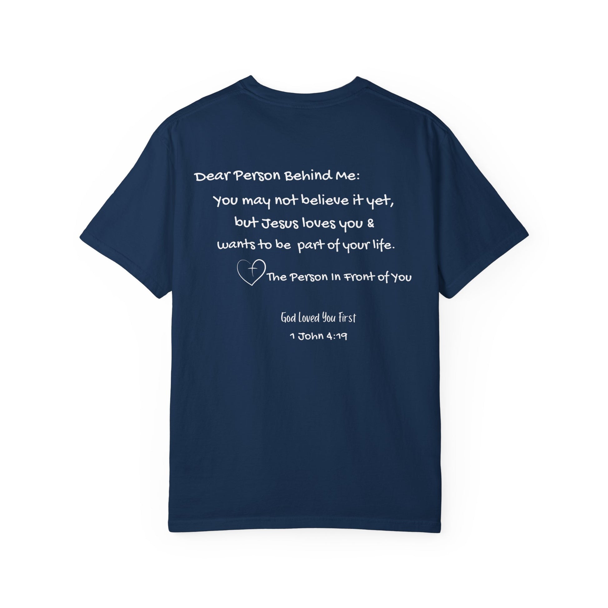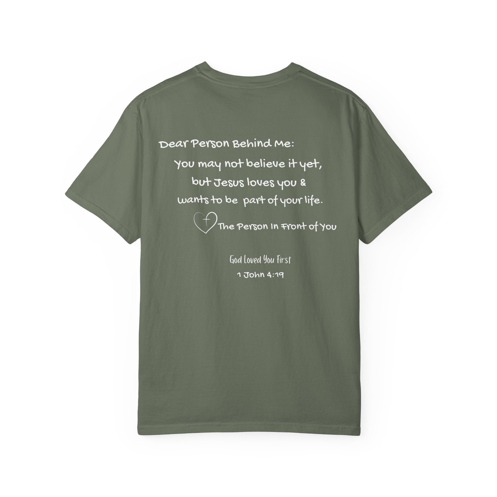 A soft and comfortable unisex garment-dyed T-shirt with the phrase 'God Loved You First' printed on the front and "Dear Person Behind Me" on the back. This tee gives a feeling of faith and positivity, making it a great addition to any casual wardrobe. Perfect for those looking to express their faith or give a meaningful gift to a loved one. Ideal for religious holidays, church events, or everyday wear.